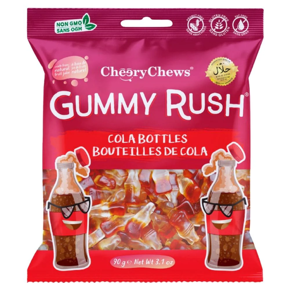 Suikers [suiker, glucosestroop, geconcentreerd appelsap (1,5%), rundergelatine (halal), zuurteregelaar (citroenzuur), glansmiddel (palmolie, camoubawas, bijenwas), kunstmatige smaakstoffen, kunstmatige kleurstoffen (tartrazine, zonnegeel FCF, allurarood, briljantblauw FCF).
